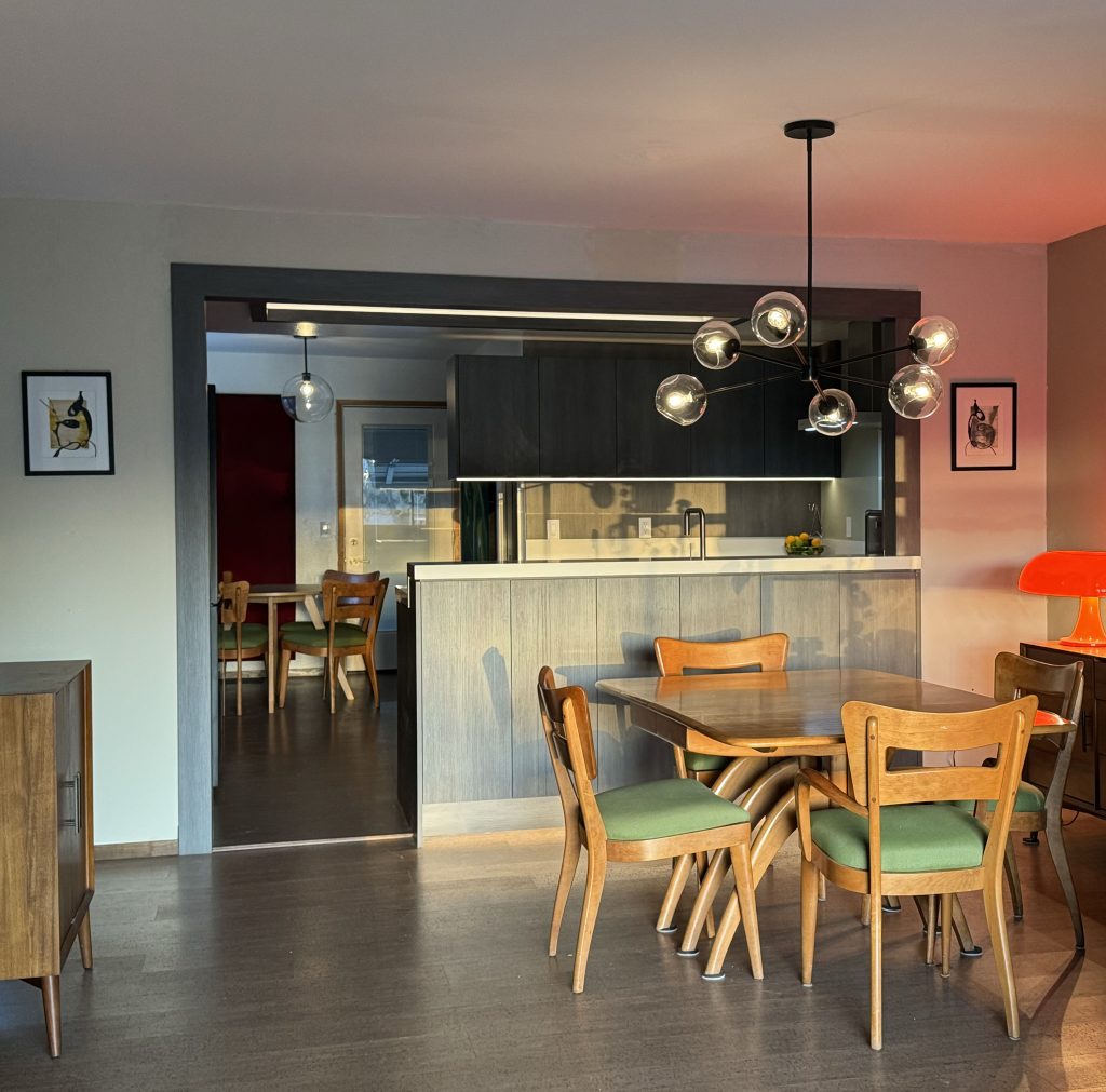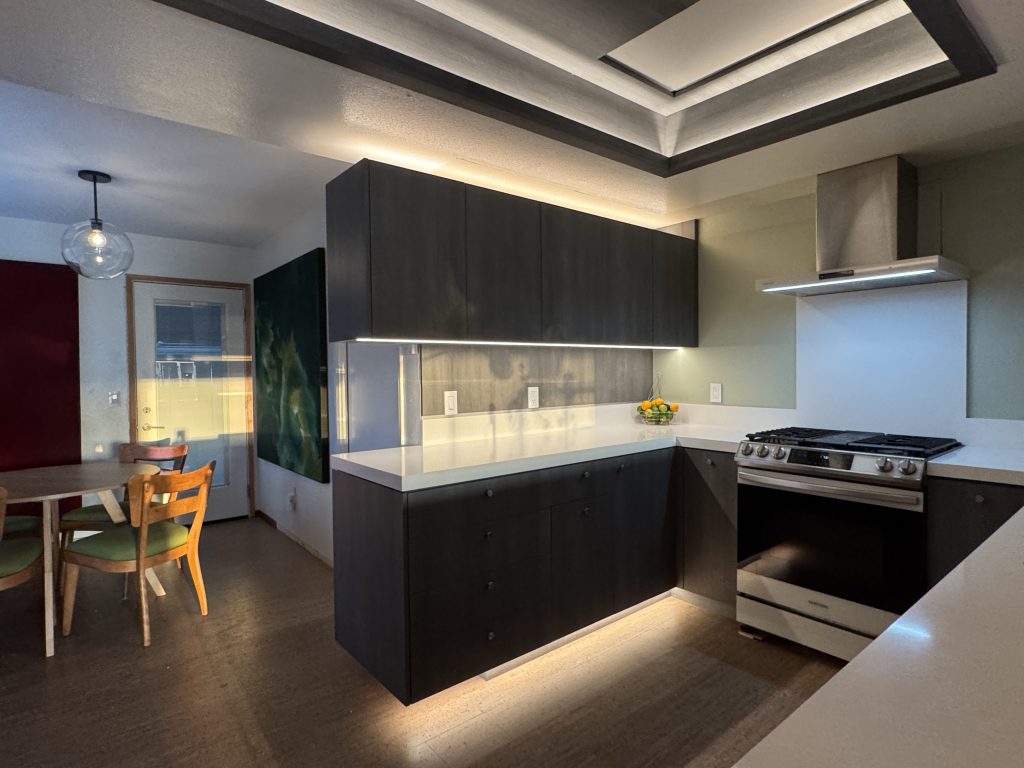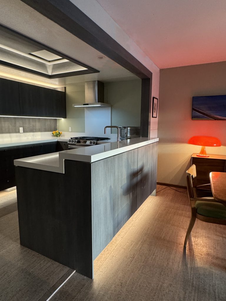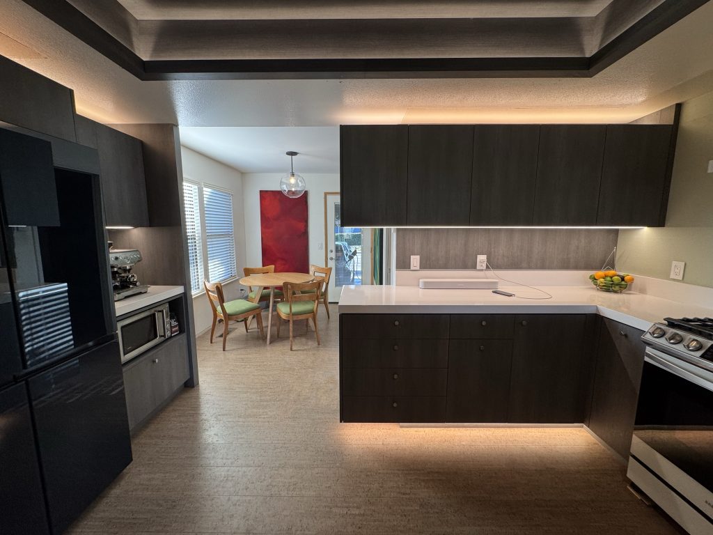 Cabinetry is wall-hung with strip LED lighting creating an illusion of a larger space. Cork flooring (a nod to being located in Wine Country) runs throughout the house connecting the breakfast area, kitchen and living room to the yard outside. The yard has a seating area that includes a fire pit and pergola for entertaining and cow watching.