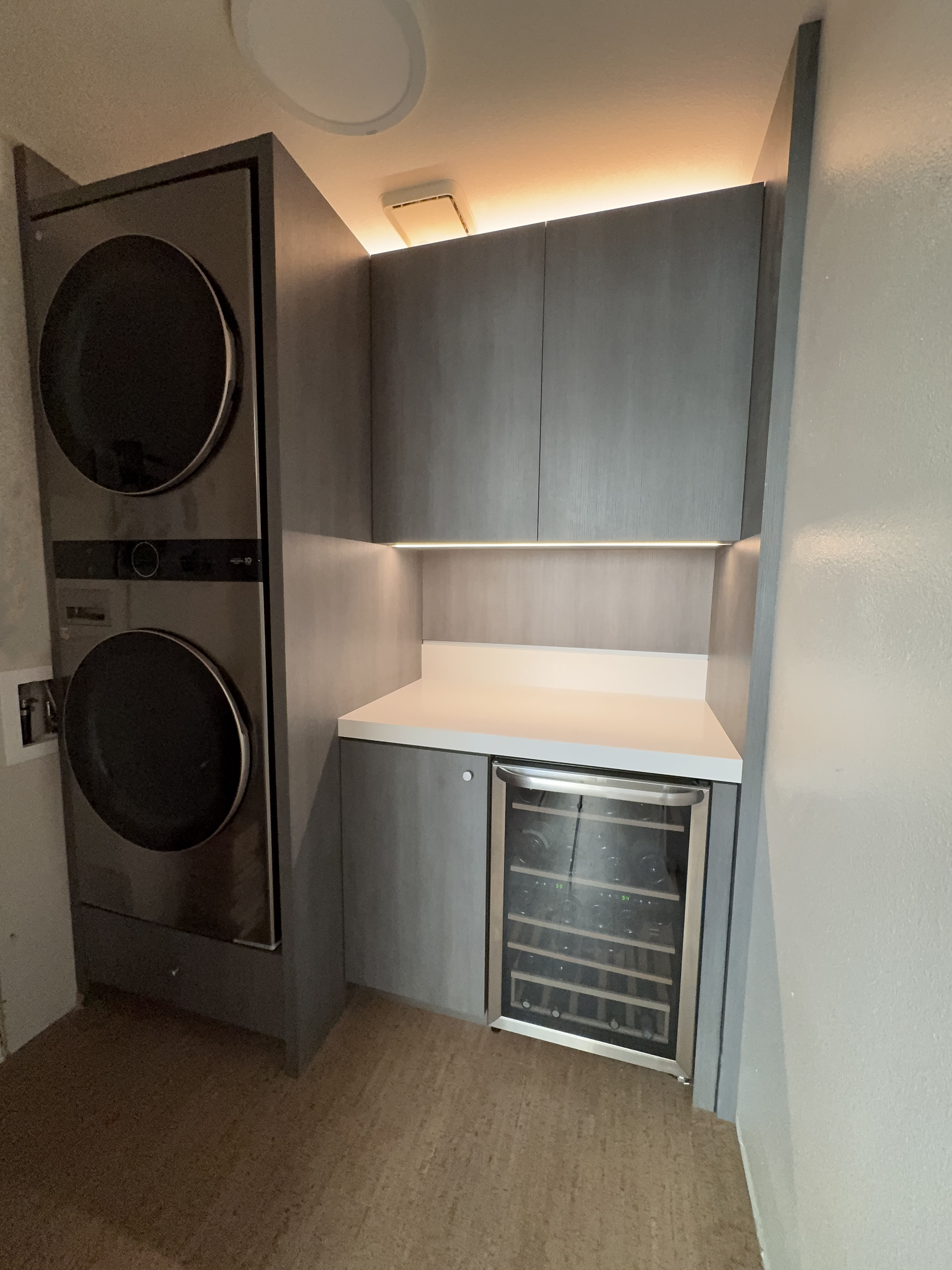 Existing laundry room has been reconfigured to create a more functional space for a dry storage pantry with a wine refrigerator. Washer and dryer have been replaced with a single unit that has a smaller footprint to one side.