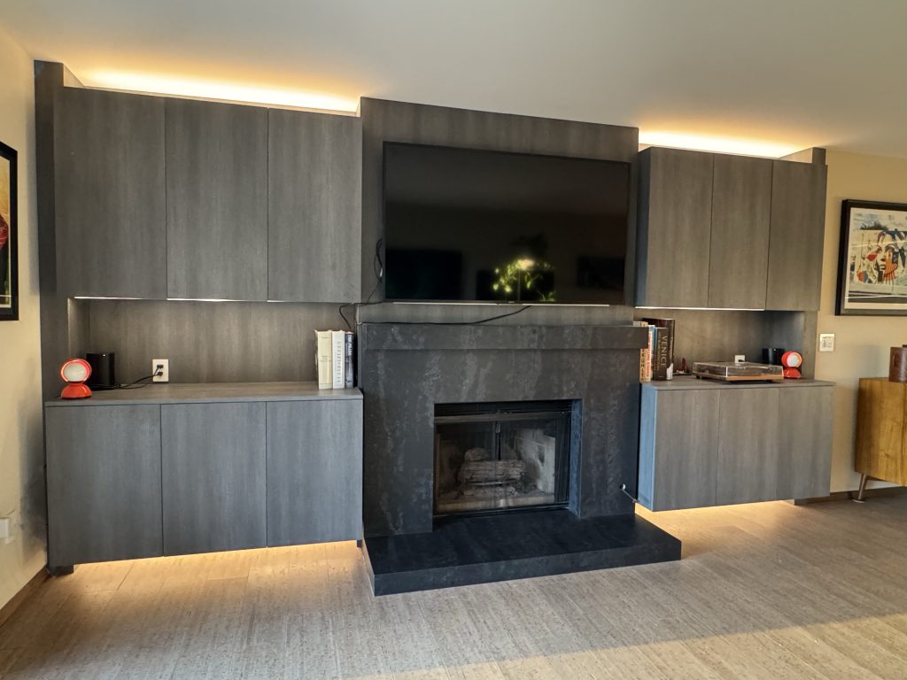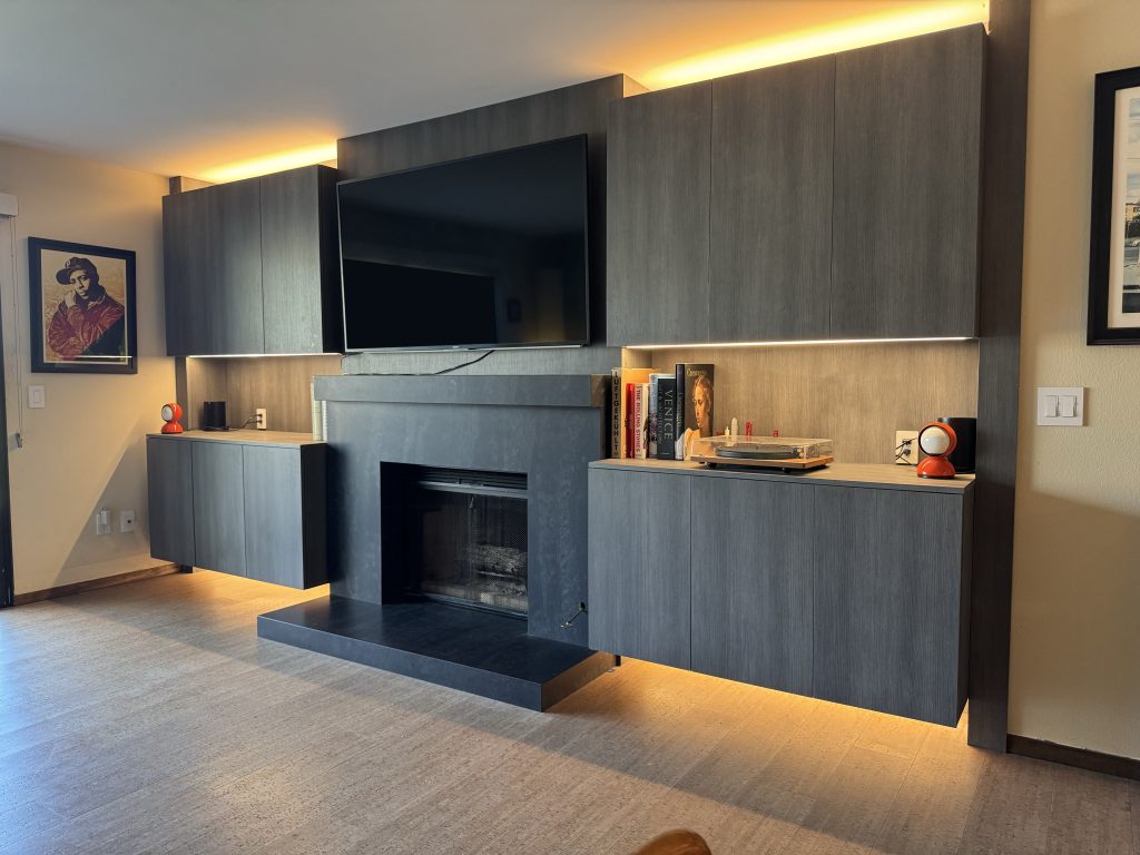 Cabinetry is wall-hung with strip LED lighting that creates the illusion of floating cabinets extruding out from an existing wall niche in the living room. The existing exposed brick fire place and hearth have been replaced by a mantle, hearth and fireplace surround that is formed from a single sheet of Caesarstone.
