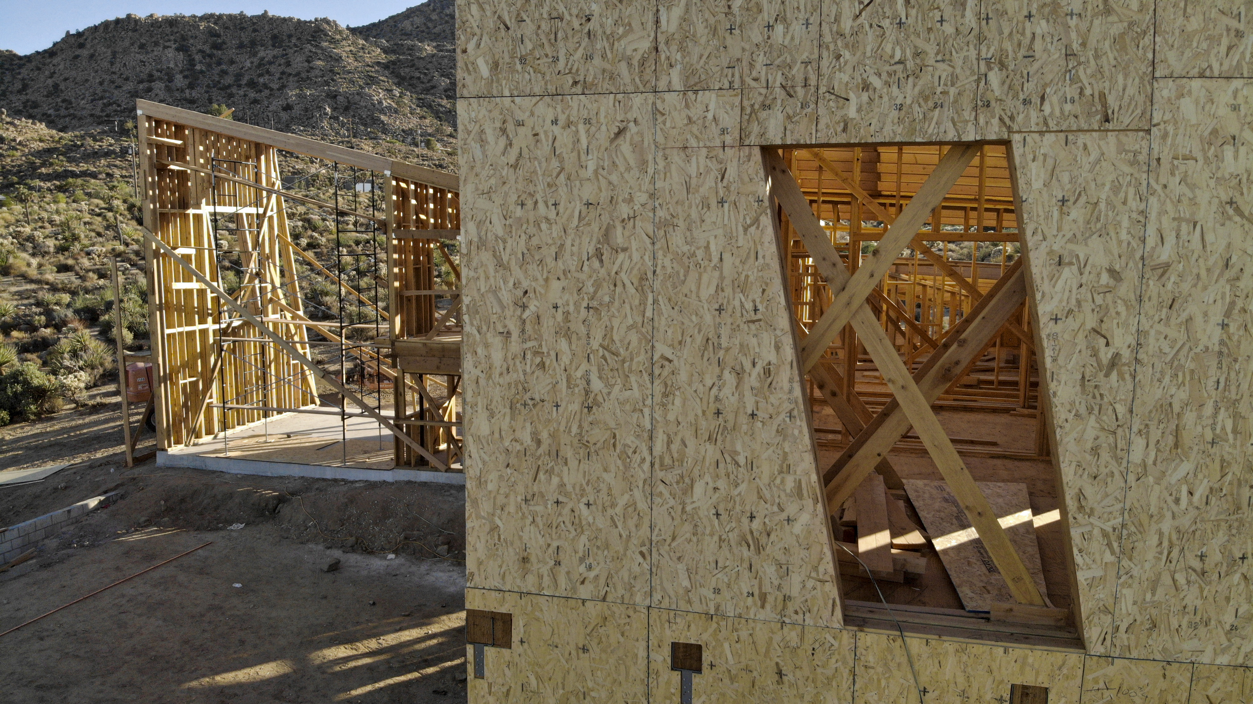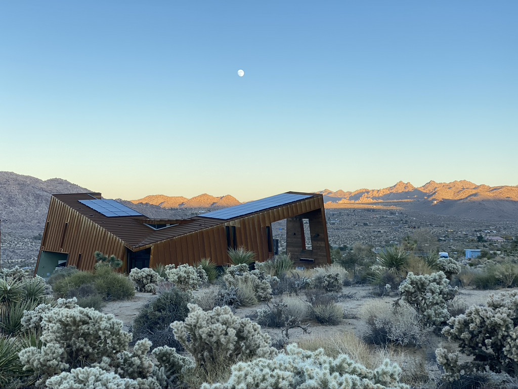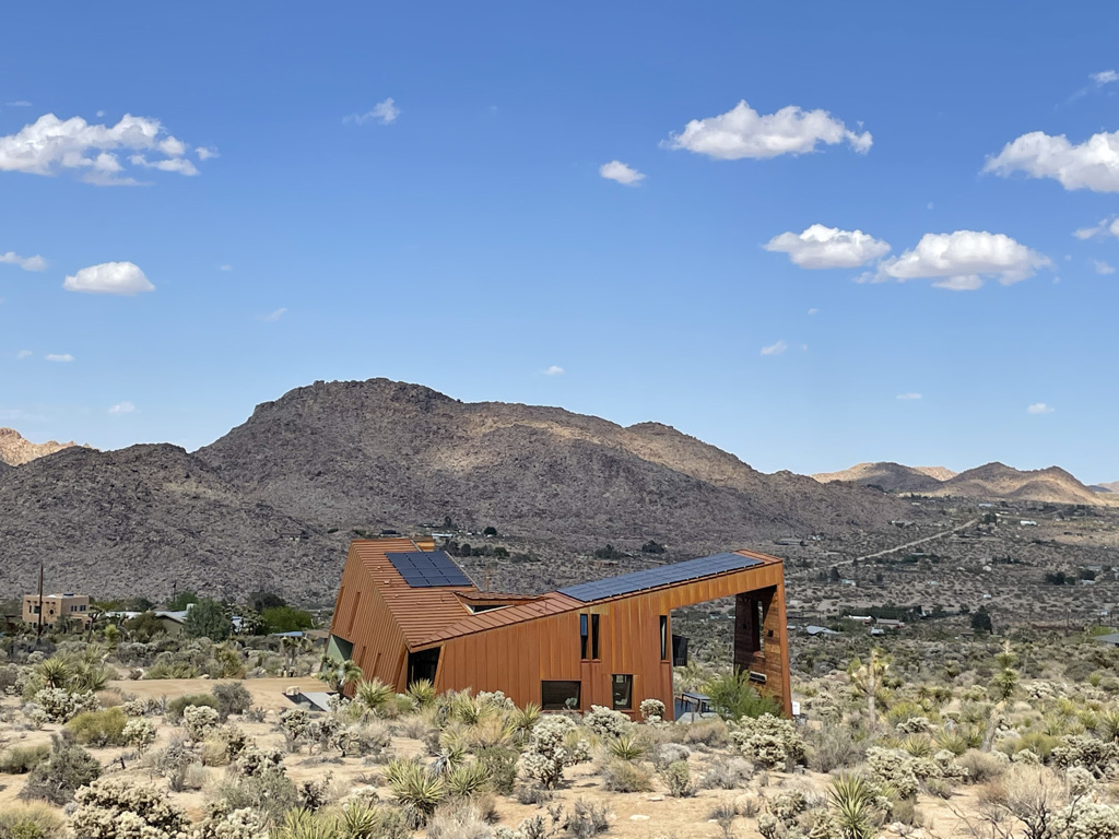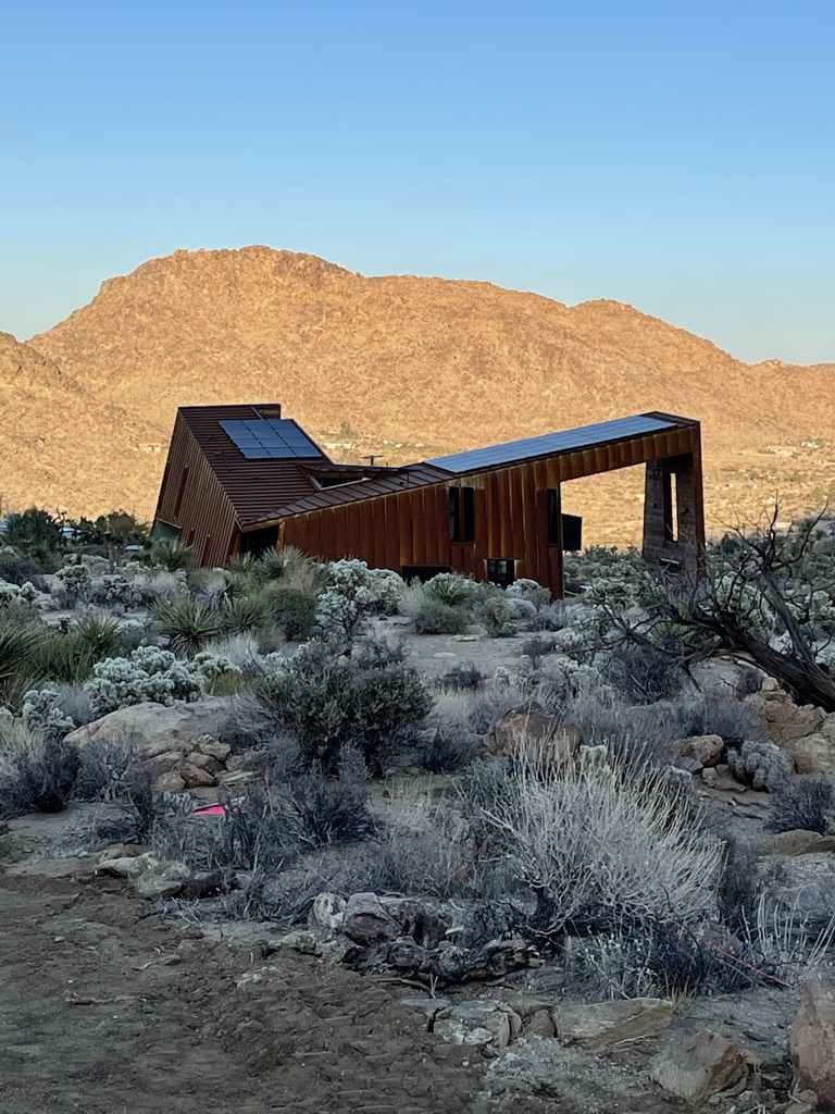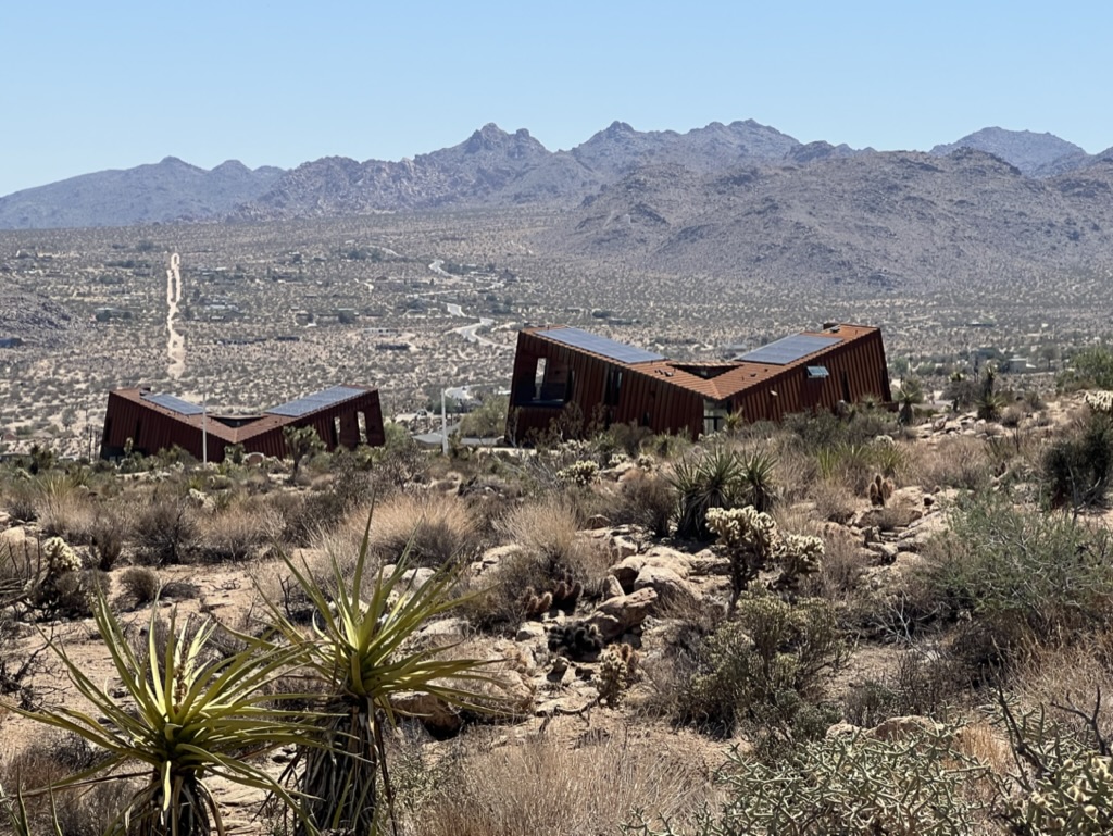 two new homes who’s profile echo the rock piles in Joshua Tree National Park beyond.